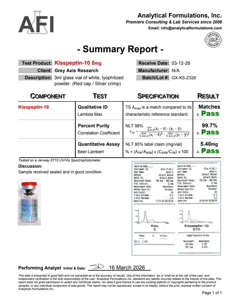Synthetic decapeptide fragment derived from the C-terminal region of human Kisspeptin. Sequence-specific bioactivity and analytical characterization are batch-verified via HPLC and MS testing as detailed in the COA.